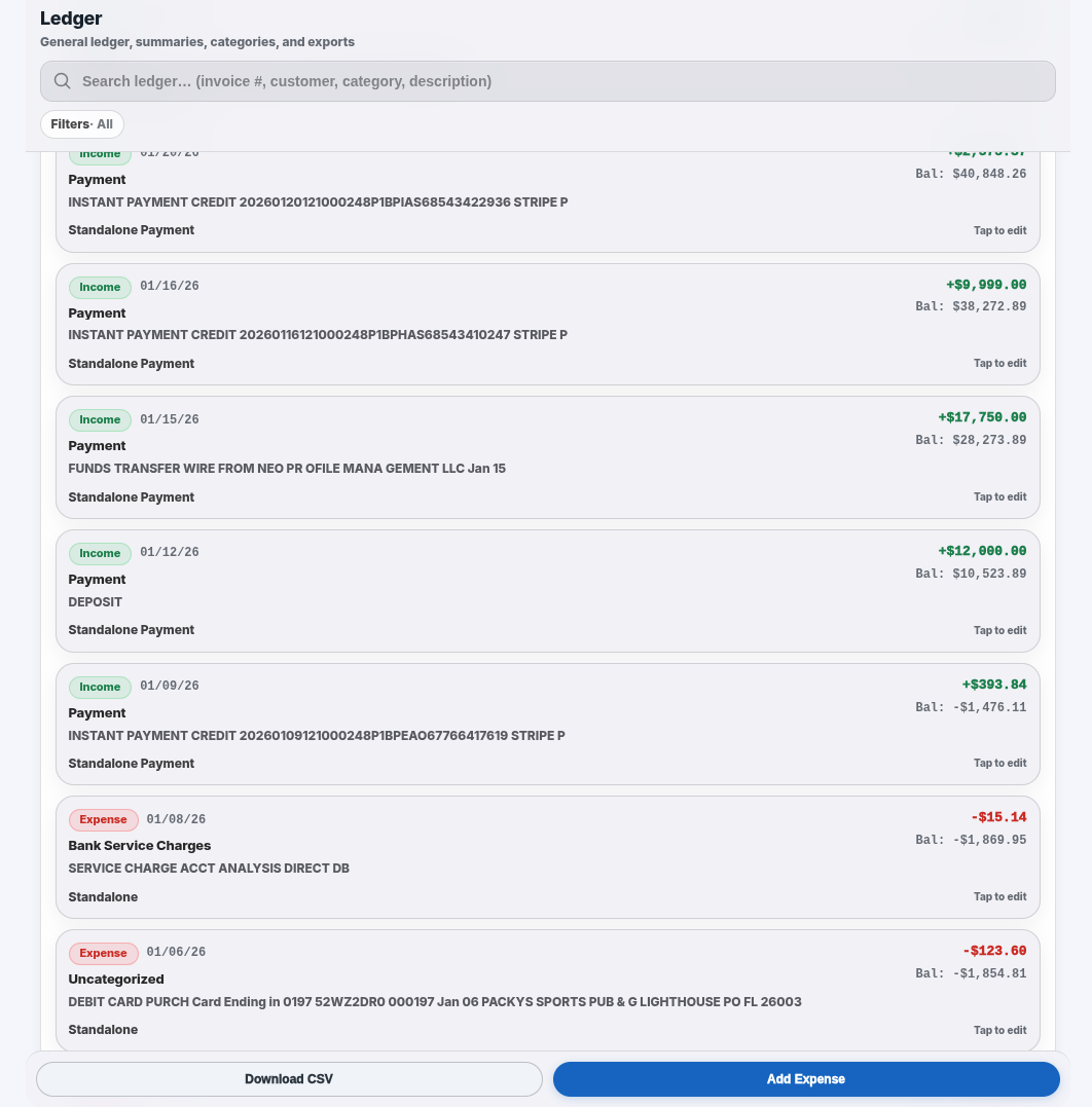The bookkeeping workspace combines payments and expenses into a searchable ledger with practical filters and category management.