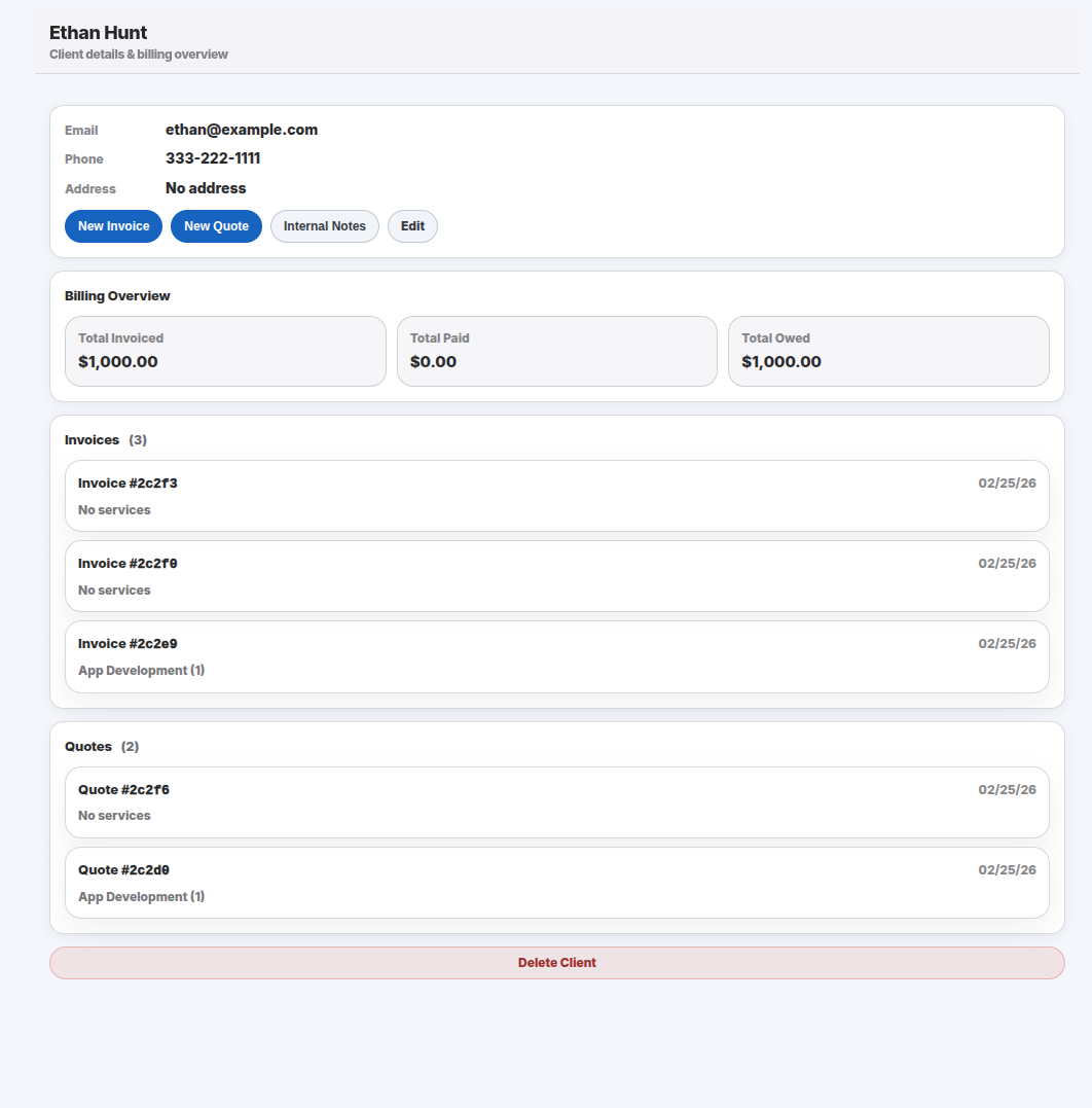 Client profiles store contact and location details while tying invoices and quotes together for better follow-up and reporting.