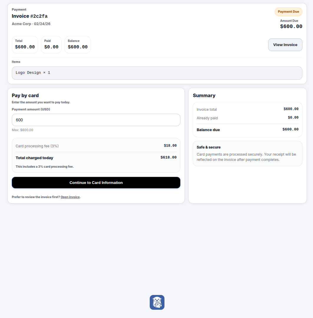 Invoice Otter combines Stripe checkout, payment logging, and payout setup so you can get paid online and keep settlement details under control.