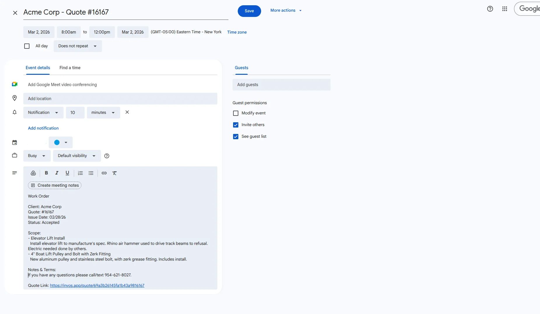Scheduling lets you release a work order from an accepted quote, open it directly in Google Calendar, and keep Invoice Otter updated with the latest scheduled time.